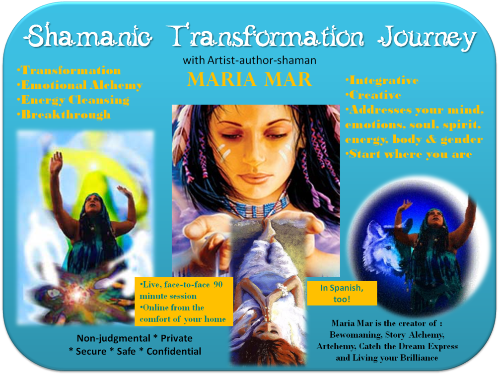 Enjoy a magical 2-hr live, face-to-face private online Shamanic Journey and consultation to experience this book as a journey with Maria Mar helping you through some of the key issues in the book.